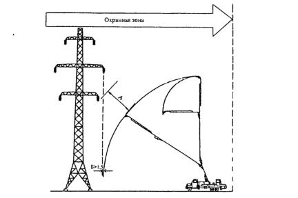 Рисунок 25 – Работа автобетононасоса в охранной зоне ЛЭП В случае обоснованной невозможности снятия напряжения с воздушной линии электропередачи и необходимости выполнения строительно-монтажных работ в охранной зоне действующей линии электропередачи должны соблюдаться следующие требования: а) работа и перемещение машин допускается только под непосредственным руководством лица, ответственного за безопасность производства работ, назначенного из числа инженерно-технических работников строительно-монтажной организации, имеющих квалификационную группу по технике безопасности не ниже IV; б) работа с применением машин допускается только в том случае, если расстояние А по воздуху от подъемной или выдвижной части строительной машины в любом ее положении, а также от поднимаемого груза, в том числе и при наибольшем подъеме или вылете до ближайшего провода, находящегося под напряжением, согласно СНиП 12-03-2001 «Безопасность труда в строительстве. Часть 1. Общие требования» должна быть не менее указанного в таблице 11. Таблица 11 Расстояние до находящейся под напряжением воздушной линии электропередачи (таблица 2 СНиП 12-03-2001)