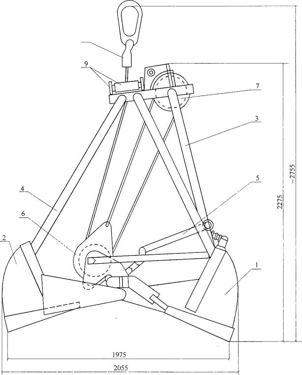 1 - челюсть тяговая; 2 - челюсть вспомогательная; 3 - тяга неповоротная; 4 - тяга поворотная; 5 - стойка качающаяся; 6 - крюк балансирный; 7 - блок на тяге неповоротной; 8 - блок на стояке качающейся; 9 - ролики; 10 - канат с коушем и кольцом. Рисунок 2 - Одноканатный двухчелюстной грейфер в закрытом положении