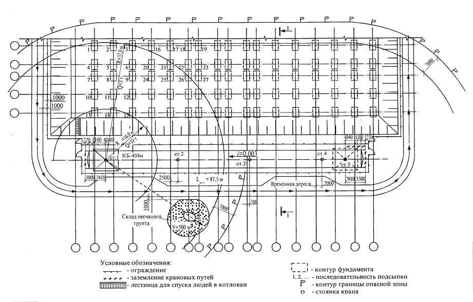 5. ОХРАНА ТРУДА И ТЕХНИКА БЕЗОПАСНОСТИ5.1 Работы по перемещению песчаного грунта с использованием двухчелюстного одноканатного грейфера производят в соответствии со СНиП III-4-80* «Техника безопасности в строительстве», СНиП 12-03-2001 «Безопасность труда в строительстве. Часть 1. Общие требования», ПБ 10-382-00 «Правила устройства и безопасной эксплуатации грузоподъемных кранов», утвержденных Госгортехнадзором России в 2000 г., «Правилами технической эксплуатации электроустановок потребителей» и «Правилами техники безопасности электроустановок потребителей», утвержденными Госэнергонадзором, проектом производства работ, настоящей технологической картой, Инструкцией по эксплуатации двухчелюстного грейфера. 5.2 Администрация строительного управления должна обеспечить содержание кранов, крановых путей, грузозахватных приспособлений в исправном состоянии. В этих целях администрация должна: - назначить приказом ответственных лиц за безопасную эксплуатацию кранов; - создать ремонтную службу, обеспечивающую содержание кранов, крановых путей, съемных грузозахватных приспособлений и тары в исправном состоянии; - установить порядок обучения и проверки знаний обслуживающего персонала; - обеспечить снабжение ИТР руководящими материалами, а обслуживающий персонал - производственными инструкциями; - обеспечить выполнение ИТР требований правил, а обслуживающему персоналу -требований производственных инструкций. 5.3 На строительной площадке должно быть в каждой смене назначено приказом лицо, ответственное за безопасное производство работ по перемещению грузов кранами, из числа инженерно-технических работников после проверки знаний соответствующих разделов ПБ 10-382-00 «Правила устройства и безопасной эксплуатации грузоподъемных кранов». Проверка знаний должна производиться комиссией. Лицам, прошедшим проверку знаний, выдается удостоверение. Периодическая проверка знаний проводится через три года. В отдельных случаях по согласованию с местным органом технадзора наблюдение за безопасной работой крана с грейфером может быть поручено бригадиру. При этом инженерно-технические работники должны выполнять обязанности по созданию безопасных условий работы. 5.4 Ответственным лицом за эксплуатацию электрохозяйства на строительном объекте должен быть назначен аттестованный инженерно-технический работник с квалификационной группой не ниже четвертой. 5.5 В случае болезни лиц, ответственных за безопасное производство работ по перемещению грузов кранами, начальнику строительного участка разрешается производить их замену только работниками, указанными в приказе о назначении лиц, ответственных за безопасное производство работ по перемещению грузов кранами. При отсутствии такой возможности издается дополнительный приказ о назначении другого аттестованного работника. Аналогично производится замена крановщиков приказом по управлению механизации. 5.6 График выхода на работу лиц, ответственных за безопасное производство работ по перемещению грузов кранами, и персонала, обслуживающего кран, составляет на объекте начальник участка (старший производитель работ) на срок не более одного месяца; график составляется не позже чем за сутки до окончания действия предыдущего. 5.7 Перед началом работ в местах, где имеется или может возникнуть 