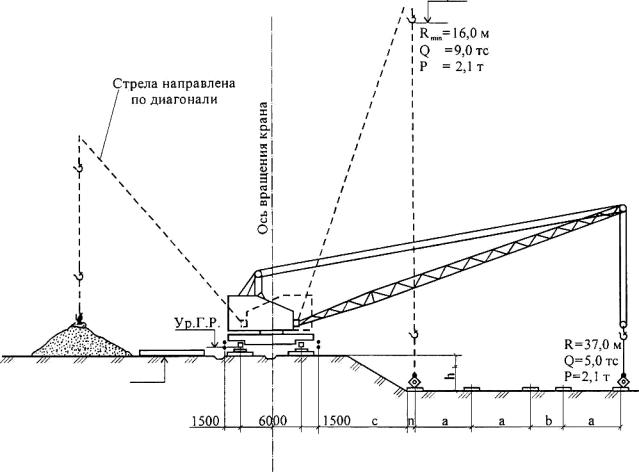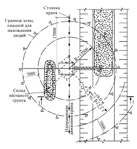 3.5 Для определения характера грунта при установке крана у выемки необходимо руководствоваться техническим заключением о грунтах Мосгоргеотреста. При наличии в откосе разнородных грунтов определение минимально допустимого расстояния от основания откоса до ближайшей опоры крана производится по одному виду грунта с наихудшими показателями. 3.6 Привязка рельсовых стреловых кранов к оси здания у котлована или траншеи определяется по формуле: SK = a + c + 0,5d+ 0,5lK, где а - расстояние от оси здания до основания откоса; с - расстояние от основания откоса котлована (траншеи) до балластной призмы: для песчаных грунтов с = 1,5hK + 400 мм; для глинистых грунтов с = hK + 400 мм; hK - глубина котлована (траншеи); d - ширина основания балластной призмы; lК - ширина колеи крана. 3.7 Привязка стреловых самоходных кранов к оси здания у котлована или траншеи определяется по формуле: SK = a + c + 0,5lon, где а - расстояние от оси здания до основания откоса; с - расстояние от основания откоса до ближайшей опоры крана согласно таблице 1; lоп- размер опорного контура для кранов с выносными опорами (колеи или базы гусеничных кранов). 3.8 Перемещение песчаного грунта в котлованы и траншеи с помощью одноканатного двухчелюстного грейфера производят в таком порядке: - раскрытый грейфер (рисунок 1) опускают на захватываемых грунт; - при касании поверхности песчаного грунта ослабляется канат и качающаяся стойка (5) опускается до нижнего положения, при этом балансирный крюк (6) входит в зацепление со стержнем челюстей. При последующей выборке каната качающаяся стойка поднимается, увлекая за собой стержень челюстей, при этом происходит постепенное смыкание челюстей и заполнение грейфера грунтом; - при подъеме грейфера, заполненного грунтом, необходимо предварительно приподнять его на высоту не более 200-300 мм для проверки правильности строповки и надежности действия тормоза. Затем грейфер поднимают на высоту не менее чем на 0,5 м превышающую встречающиеся на пути предметы, и перемещают в горизонтальном направлении к месту разгрузки; - для раскрытия заполненного одноканатного двухчелюстного грейфера (рисунок 2) его опускают на грунт. При ослаблении каната балансирный крюк под действием противовесов выходит из зацепления со стержнем челюстей. При «выборке» каната происходит раскрытие освобожденных челюстей под собственной массой и массой грунта и материал высыпается; - раскрытый грейфер возвращают к месту загрузки и цикл повторяется. 3.9 Схема производства работ при перемещении песчаного грунта грейфером, навешенным на крюк крана КБ-404м, показана на рисунках 3, 4. 3.10 Схема производства работ при перемещении песчаного грунта грейфером, навешенным на крюк крана РДК-25, показана на рисунке 5. 3.11 При перемещении песчаного грунта грейфером, навешенным на крюк крана КБ-404.м-1, работы выполняет машинист крана 5-го разряда. При перемещении песчаного грунта грейфером, навешенным на крюк крана РДК-25, работы выполняет машинист крана 6-го разряда и помощник машиниста 5-го разряда.