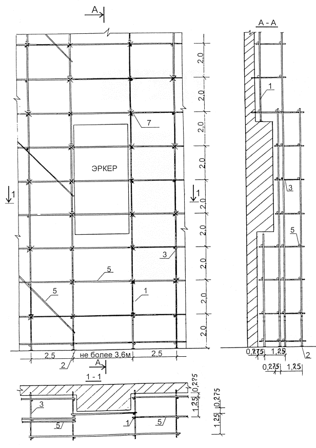 ИЛЛЮСТРАЦИИрис.1 Схема установки лесов по наружному ряду стоек. Общий вид. 1 - башмак опорный; 2 - стойка короткая; 3 - стойка длинная; 4 - связь короткая; 5 - связь длинная; 6 – поперечина; 7 - связь диагональная; х - крепление лесов к стене