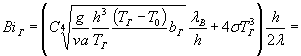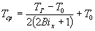 множитель 3.1.1. Принимая в первом приближении величину критерия Bi=4 и температуру нагретой поверхности оборудования ТГ на 200 К больше заданной температуры T0 , вычислить среднюю (между температурами холодной поверхности и газового пространства) температуру Тср по формуле 3.1.2. Рассчитать комплекс g/aν и коэффициент теплопроводности воздуха по уравнениям: 3.1.3. По найденным выше значениям определить другую величину критерия Био по выражению где С - коэффициент, равный 0,27 для горизонтальной пластины, обращенной горячей стороной вниз, и 0,54 для горизонтальной пластины, обращенной горячей стороной вверх. 3.1.4. Найденное в п. 3.1.3 значение Bi подставить в формулу (22) и по выражениям (23)-(25) найти новое значение критерия Био. Процесс итераций продолжать до тех пор, пока последняя и предыдущая величины не будут отличаться друг от друга менее чем на 10%. 3.1.5. Вычислить безразмерный температурный перепад параметры 3.1.6. Для температуры ТГ определить параметры