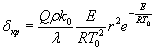 множитель 3.2.1. Принимая в первом приближении величину критерия Био на холодной стенке слоя Bix=4 и температуру среды внутри трубопровода ТГ на 200 К более T0, вычислить среднюю (между температурами холодной и горячей поверхностей слоя отложений) температуру Tср по формуле 3.2.2. Рассчитать комплекс g/aν и коэффициент теплопроводности воздуха по уравнениям (23) и (24). 3.2.3. По найденным выше значениям определить другую величину критерия Био на холодной стенке: 3.2.4. Найденное в п. 3.2.3 значение Bi подставить в формулу (30) и по выражениям (23), (24), (31) найти новое значение критерия Био. Процесс итераций продолжать до тех пор, пока последняя и предыдущая величины не будут отличаться друг от друга менее чем на 10%. 3.2.5. Определить значение кинематической вязкости воздуха по выражению 3.2.6. Вычислить величину критерия Био на горячей стенке слоя по выражению 3.2.7. Рассчитать безразмерный температурный перепад и параметр а по выражениям (26), (27). 3.2.8. Определить параметр δ по формуле 3.2.9. Для температуры ТГ определить параметры р и у; рассчитать критическую величину d по формуле (15). 3.2.10. Подставить величину dкр в уравнение (11) и найти новое значение температуры ТГ. 3.2.11. Используя это значение ТГ, повторить расчет параметров по пп. 3.2.1-3.2.10. 3.2.12. Указанную процедуру расчета продолжать до тех пор, пока предыдущее и последующее значения температуры не будут отличаться друг от друга, менее чем на 1 К. За критическую температуру принимается результат последнего расчета. 3.3. Критический размер отложений на нагретой поверхности оборудованияИсходными данными для расчета критического размера отложений на нагретой поверхности оборудования являются: • температура поверхности, на которой образуются отложения, ТГ, К; • температура газовой среды около холодной поверхности слоя T0 , К; • коэффициент теплопроводности материала l, Вт/(м × К); • теплоемкость исследуемого материала с, Дж/(кг × К); • теплота реакции Q, Дж/кг; • энергия активации реакции окисления Е, Дж/моль; • предэкспоненциальный множитель Qk0l, м × К/кг. 3.3.1. Принимая в первом приближении величину критерия Bi=5, в соответствии с пп. 3.1.1-3.1.2 определить температуру Tср, комплекс g/av и коэффициент теплопроводности воздуха. 3.3.2.