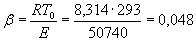 11. Сравнивая это значение r с его величиной, полученной в п. 5, видим, что учет интенсивности теплообмена практически не изменил значения критического размена. Перевозка костной муки в железнодорожных вагонах насыпью представляет опасность самовозгорания этого продукта. 4. Пример расчета времени индукцииРассчитать время индукции при перевозке костной муки в вагоне при температуре 20°С (293 К). Исходными данными для расчета являются: • температура перевозки материала Т0=293 К; • критическая температура самовозгорания для заданного размера и формы упаковки материала Ткр=263 К; • фактор формы упаковки материала j=1,11; • размер упаковки r= • плотность упаковки материала r=660 кг/м3; • коэффициент теплопроводности материала l=0,14 Вт/(м × К); • теплоемкость исследуемого материала с=780 Дж/(кг × К); • теплота реакции Q=350 000 Дж/кг; • энергия активации реакции окисления Е=50 740 Дж/моль; • предэкспоненциальныи множитель Qk0/l=2,46 × 1. По температуре Т0 вычислим параметры b и g с помощью формул (8) и (9):