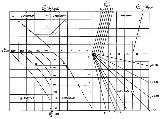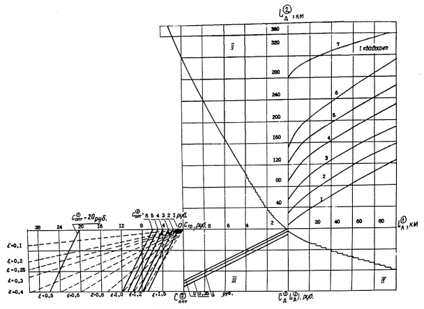 базового материала по железной дороге Определенная таким образом стоимость базового материала должна соответствовать сумме отпускной цены и затрат на перевозку эквивалентного количества нового материала (отходов ТЭС). В прил. 2, б показано, что из установленной ранее эквивалентной стоимости базового материала следует вычесть (в III квадранте) отпускную пену нового материала (отходов ТЭС). Полученная величина (отложенная на горизонтальной оси во II квадранте) соответствует суммарным затратам на перевозку нового материала по железной дороге и автомобильным транспортом. Одинаковым суммарным транспортным затратам соответствует множество соотношений между расстояниями возки материалов по железной дороге и автомобильным транспортом. В I квадранте представлены кривые, определяющие такие соотношения между расстояниями перевозки нового материала по железной дороге и автомобильным транспортом, при которых, суммарные транспортные затраты являются постоянными и равными 2; 3; 4; 5; 6; 7; 8; 9; 10; 11 руб. за 1 т. 3.3. Для конкретного значения суммарной стоимости перевозки 1 т отходов ТЭС и ГРЭС экономически рациональная область их использования определится (см. прил. 2, б) множеством соотношений между расстояниями возки отходов автомобильным и железнодорожным транспортом, расположенным ниже кривой, соответствующей стоимости транспортных расходов. 3.4. Если базовый и новый материалы перевозят по одинаковым участкам транспортных схем железнодорожным или автомобильным транспортом, то в правой и левой частях выражения (4) исключают члены, определяющие соответствующие затраты. Рациональные области использования отходов ТЭС и ГРЭС в таком случае определяются предельно допустимыми соотношениями между расстояниями возки базового и нового материалов только одним видом транспорта. Номограммы для определения рациональных областей использования отходов ТЭС и ГРЭС при перевозках их только железнодорожным и автомобильным транспортом представлены на рис. 1, 2 прил. 1. 3.5. Номограммы для определения предельно допустимого соотношения между расстояниями транспортирования базового и нового материалов каким-либо одним видом транспорта (см. рис. 1, 2 прил. 1) строят в прямоугольной системе координат, в I квадранте которой по осям абсцисс и ординат откладывают расстояния перевозки базового и нового материалов автомобильным транспортом (по железной дороге). Во II и IV квадрантах строят графики изменения стоимости перевозки 1 т груза в зависимости от расстояния их транспортирования. В III квадранте проводят прямые, с помощью которых, к величинам затрат на транспортирование нового материала из II квадранта прибавляется его отпускная цена. Аналогично в IIIa, квадранте проводят прямые, с помощью которых к транспортным затратам при перевозке базового материала прибавляется его отпускная цена. В IIIa, квадранте пучок штриховых линий позволяет привести базовый и новый материалы в сопоставимый вид по содержанию в единице длины конструктивного элемента сооружаемой автомобильной дороги. Граница области рационального использования отходов ТЭС и ГРЭС определится, когда приведенные в сопоставимый вид суммы отпускных цен базового и нового материалов и затрат на их перевозку совпадут (см. рис. 1, 2 прил. 1). Порядок действий при этом следующий. На горизонтальной оси I квадр