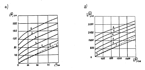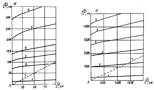 Рис. 3. Зависимость предельного экономически целесообразного расстояния транспортирования золы уноса автомобильным (а) и железнодорожным (б) транспортом от расстояния перевозки заменяемого ею цемента при различной величине относительного расхода рассматриваемых материалов e(e=Vцем/Vзол): 1 - 0,1; 2 - 0,2; 3 - 0,25; 4 - 0,3; 5 - 0,4; 6 - 0,5 ; 7 - линия равных расстояний перевозки цемента и золы уноса.