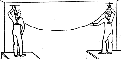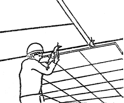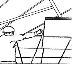 4.4. Методы в приемы труда. 1 Вынесение отметок. Стоя на подмостях, монтажники производят вынесение отметок установки опорного уголка на стены при помощи водяного уровня (рис. 1). 2. Нарезка уголка. Определяют необходимый размер уголка с помощью складного метра и по этим замерам нарезают его при помощи пилы-ножовки (рис. 2). 3. Установка уголка. Монтажники устанавливают уголок по периметру стен и колонн, временно его закрепляют специальными подкосами Затем закрепляют уголок пристрелкой дюбелями при помощи монтажно-поршневого пистолета ПЦ-52-1 (рис. 3 и 4). 4. Вынесение отметок чистого потолка - см. п.1. 5. Натягивание шнура. Для каждого ряда плит по всей длине помещения монтажники натягивают шнур. Крепление концов шнура производят за полки опорного уголка, установленного по периметру помещения. Натянутый шнур должен соответствовать уровню низа подвесного потолка. 8. Сортировка плит. Производят сортировку плит по размерам на столе для раскроя плит при помощи металлической линейки. Прямоугольность плит проверяют металлическим угольником. Затем проверяют соответствие прорезей в плитах толщине и длине закладных деталей (рис. 5), 7. Установка креплений на плиты. В готовые прорези, находящиеся с двух сторон одного угла плиты, устанавливают закладные детали П-1. Металлическую скобу П-2 заводят за загнутые концы деталей П-1 и соединяют их между собой (рис. 6). 8. Установка подвесок. Монтажники, стоя на подмостях, одевают один конец пластины на стержень подвески, затем прислонив подвеску к направляющей, одевают второй конец пластины на стержень так, чтобы направляющая прошла между согнутой пластиной и стержнем (рис. 7). 9. Прирезка плит с подгонкой. При необходимости монтажники обрезают гипсовые плиты до требуемого размера ножовкой, следя за тем, чтобы не повредить кромки и лицевой поверхности плиты. 10. Вырезка отверстий в плитах. В местах выходов электропроводки вырезают отверстия при помощи коловорота. 11. Установка гипсовых плит. Первую гипсовую плиту устанавливают так, чтобы один из углов плиты опирался на опорный уголок, а свободный угол плиты - тот, где установлено крепление, подвешивают на двух подвесках. Вторую плиту опирают двумя сторонами на полку ранее уложенной плиты и уголок, а свободный угол подвешивают на подвесках и т.д. укладывают первый ряд плит. В последующих рядах плиты опирают двумя сторонами на полки ранее уложенных плит, а свободный угол плиты подвешивают на подвесках. 12. Выверка установленных плит. Каждую установленную плиту выверяют при помощи водяного уровня на горизонтальность и соответствие отметкам чистого потолка. Положение плиты по вертикали регулируют пружинной пластиной подвески П-1 (рис. 3). 4.5. График производства работ звена по устройству потолков из гипсовых плит составлен на работы в объеме 150 м2 потолков. Организация рабочих мест звена - см. на рис. 9, 10. 4.6. До начала работ по устройству подвесных потолков из гипсовых декоративных плит ответственный за их производство обязан обеспечить проведение инструктажа рабочих и выдачу необходимого инструмента в средств индивидуальной защиты. При выполнении работ необходимо соблюдать правила техники безопасности, изложенные в СНиП III-А.11-70 "Техника безопасности о строительстве", в "Правилах пожарной безопасности при производстве строительно-монтажных работ" и в "Инструкции п