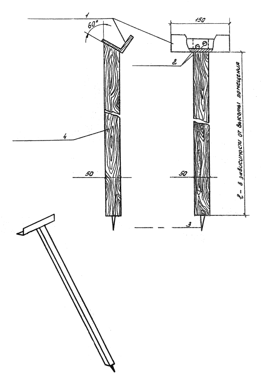Рис. 4. Подкос для поддерживания уголка на время крепления, его к стене: 1 - уголок 25×25; 2 -шуруп 40×40; 3 - штырь опорный;4 - брусок