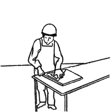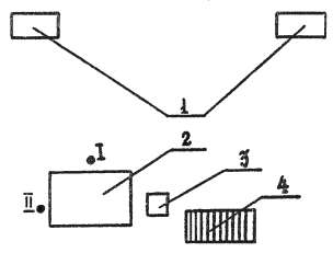 Рис. 10. Организация рабочего места звена монтажников при установке плит: 1 - подмости; 2 – стол для раскроя плит; 3 - ящик с инструментами; 4 - ящик с отсортированными и подготовленными плитами I - монтажник V разряда (производит сортировку плит; II - монтажник IV разряда (устанавливает крепления, на плиту)