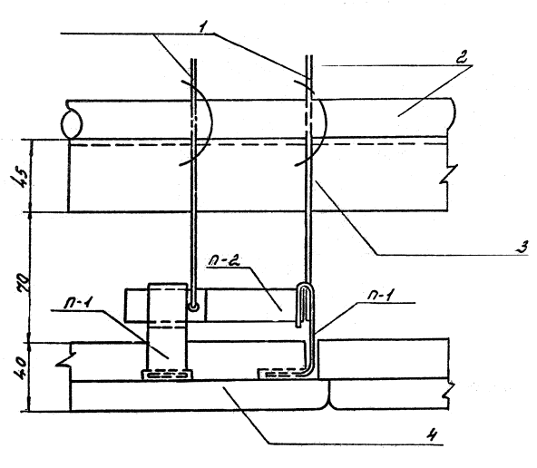 Рис. 6. Схема установка гипсовых плит: 1 - подвеска; 2 - направляющая; 3 - несущий уголок 45×5; 4 - гипсовая плита