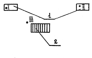 Рис. 9. Организация рабочего места звена монтажников при подготовке гипсовых плат: 1 - подмости; 2 - ящик с платами; 1 - монтажник V разряда (устанавливает и выверяет плиты); II - монтажник IV разряда (устанавливает и выверяет плиты); III - подсобный разряда (подает плиты монтажникам)