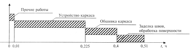 ГВЛ выпускают с различными формами продольных кромок: фальцевая (ФК); прямая (ПК). Данная технологическая карта предусматривает обшивку каркаса ГВЛ с фальцевой кромкой (ФК). Масса 1 м2 (поверхностная плотность) ГВЛ - 1,05S < m < 1,2 S (кг/м2), где S - толщина листа, мм. Удельная активность естественных радионуклидов не более 370 Бк/кг (ГОСТ 12.1.044-89*), т.е. ГВЛ относится к 1 группе. Пожаротехнические характеристики ГВЛ соответствуют: - горючесть - Г1 (ГОСТ 30244-94); - воспламеняемость - В1 (ГОСТ 30402-96); - дымообразующая способность - Д1 (ГОСТ 12.1.044-89); - токсичность - Т1 (ГОСТ 12.1.044-89). Отпускная влажность листов не должна превышать 1,5 %; плотность - не более 1250 кг/м3. 1.7. Для крепления ГВЛ к каркасу перегородок применяют самонарезающие винты с зенкующей головкой, а для крепления элементов каркаса перегородок к конструкциям здания - дюбели. 1.8. Монтаж перегородок производят в период отделочных работ по окончании «мокрых» процессов, способных существенно повысить влажность воздуха внутри помещения, до устройства чистого пола. В помещениях, где производят монтаж перегородок С 366, температура воздуха не должна быть ниже +10 °С. Температурно-влажностный режим помещения должен соответствовать требованиям СНиП 23-02-2003 «Тепловая защита зданий». 1.9. Типовая технологическая карта разработана на измеритель конечной продукции 1 м2 перегородки. Привязка типовой технологической карты к конкретному объекту и условиям строительства состоит в уточнении необходимых материальных ресурсов и схем организации строительного процесса, соответствующего рабочим чертежам. 2. Организация и технология выполнения работ 2.1. К устройству перегородок С 366 рекомендуется приступать только после: - наличия утвержденной проектной документации (рабочих чертежей); - наличия проекта производства работ, который должен предусматривать комплексную механизацию работ с наиболее полным использованием специализированного инструмента и приспособлений, способствующих повышению производительности труда, сокращению сроков возведения перегородок, уменьшающих трудозатраты и создающих наиболее безопасные условия труда; - производства организационно-технологической подготовки, которая включает в себя подготовку необходимой оснастки, средств подмащивания и доставки ГВЛ в зону производства работ (см. рисунок 3). 2.2. До начала монтажа элементов перегородки необходимо закончить все общестроительные, а также строительно-монтажные работы, которые могут вызвать повышение влажности ГВЛ. Произвести уборку строительного мусора. Произвести инструментальную проверку соответствия основания для установки направляющих и стоечных профилей каркаса перегородки. Подготовленное основание должно быть оформлено актом приемки за подписью ответственных представителей строительной организации. 2.3. Работы по монтажу перегородок С 366 выполняют под руководством ИТР. Рабочие, выполняющие монтажные работы, должны пройти техническое обучение в учебных центрах «КНАУФ» или других специализированных учебных заведениях и иметь удостоверение на право производства работ. 2.4. Возведение перегородок производят поточно-расчлененным методом, по захваткам, со специализацией звеньев бригады на выполнение однотипных работ и оснащенных соответствующим набором инструментов, инвентаря и средств подмащивания. Каждое звено состоит и