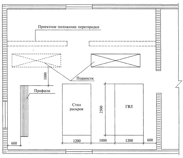 ГВЛ выпускают с различными формами продольных кромок: фальцевая (ФК); прямая (ПК). Данная технологическая карта предусматривает обшивку каркаса ГВЛ с фальцевой кромкой (ФК). Масса 1 м2 (поверхностная плотность) ГВЛ - 1,05S < m < l,2S (кг/м2), где S - толщина листа, мм. Удельная активность естественных радионуклидов не более 370 Бк/кг (ГОСТ 12.1.044-89*), т.е. ГВЛ относится к 1 группе. Пожаротехнические характеристики ГВЛ соответствуют: - горючесть - Г1 (ГОСТ 30244-94); - воспламеняемость - В1 (ГОСТ 30402-96); - дымообразующая способность - Д1 (ГОСТ 12.1.044-89); - токсичность - Т1 (ГОСТ 12.1.044-89). Отпускная влажность листов не должна превышать 1,5 %; плотность - не более 1250 кг/м3. 1.7. Для крепления ГВЛ к каркасу перегородок применяют самонарезающие винты с зенкующей головкой, а для крепления элементов каркаса перегородок к конструкциям здания - дюбели. 1.8. Монтаж перегородок производят в период отделочных работ по окончании «мокрых» процессов, способных существенно повысить влажность воздуха внутри помещения, до устройства чистого пола. В помещениях, где производят монтаж перегородок С 367, температура воздуха не должна быть ниже +10 °С. Температурно-влажностный режим помещения должен соответствовать требованиям СНиП 23-02-2003 «Тепловая защита зданий». 1.9. Типовая технологическая карта разработана на измеритель конечной продукции - 1 м2 перегородки. Привязка типовой технологической карты к конкретному объекту и условиям строительства состоит в уточнении необходимых материальных ресурсов и схем организации строительного процесса, соответствующего рабочим чертежам. 2. Организация и технология выполнения работ 2.1. К устройству перегородок С367 рекомендуется приступать только после: - наличия утвержденной проектной документации (рабочих чертежей); - наличия проекта производства работ, который должен предусматривать комплексную механизацию работ с наиболее полным использованием специализированного инструмента и приспособлений, способствующих повышению производительности труда, сокращению сроков возведения перегородок, уменьшающих трудозатраты и создающих наиболее безопасные условия труда; - производства организационно-технологической подготовки, которая включает в себя подготовку необходимой оснастки, средств подмащивания и доставки ГВЛ в зону производства работ (см. рисунок 3). 2.2. До начала монтажа элементов перегородки необходимо закончить все обще строительные, а также строительно-монтажные работы, которые могут вызвать повышение влажности ГВЛ. Произвести уборку строительного мусора. Произвести инструментальную проверку соответствия основания для установки направляющих и стоечных профилей каркаса перегородки. Подготовленное основание должно быть оформлено актом приемки за подписью ответственных представителей строительной организации. 2.3. Работы по монтажу перегородок С 367 выполняют под руководством ИТР. Рабочие, выполняющие монтажные работы, должны пройти техническое обучение в учебных центрах «КНАУФ» или других специализированных учебных заведениях и иметь удостоверение на право производства работ. 2.4. Перегородки возводят поточно-расчлененным методом, по захваткам, со специализацией звеньев бригады на выполнение однотипных работ и оснащенных соответствующим набором инструментов, инвентаря и средств подмащивания. Каждое звено состоит из двух челове