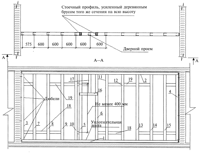 Соединение (удлинение) профилей производят с помощью просекателя методом «просечки с отгибом», в отдельных случаях посредством винтов LN 3,5´9. Стоечные профили должны иметь высоту на 10 мм меньше расстояния между стенками верхних и нижних направляющих профилей. Установку направляющих профилей осуществляют согласно разметке их проектного положения на полу и на потолке. С целью повышения звукоизоляционной способности перегородки на стенки направляющих профилей ПН наклеивают уплотнительную ленту. После раскроя и полной подготовки направляющих профилей приступают к их монтажу по линии разметки на полу, а затем - на потолке. Крепление направляющих профилей осуществляют дюбелями с шагом не более 1 м. Закреплять профиль ПН необходимо не менее чем в трех точках независимо от его длины. При необходимости дополнительные отверстия в стенке направляющего профиля высверливают дрелью. Установку стоечных профилей также осуществляют по их проектному положению, а их типоразмер должен соответствовать рабочим чертежам (в рассматриваемом случае шаг стоек равен 600 мм). Предварительно на стоечные профили, примыкающие к конструкциям здания, наклеивается уплотнительная лента. Стоечные профили устанавливают в закрепленные в проектном положении направляющие профили. Установку стоек начинают от стен, к которым профили крепятся дюбелями с шагом не более 1 м, но не менее трех креплений на одну стойку. Каждая стойка устанавливается строго вертикально и с помощью просекателя закрепляется к направляющему профилю на полу и на потолке. Закрепление производят не менее чем в двух точках с каждой стороны направляющего профиля (т.е. четыре просечки вверху и четыре просечки - внизу). Устройство вставок в каркасе 3-слойной перегородки не требуется. Если перегородка имеет дверной проем, то дверную коробку устанавливают одновременно с монтажом каркаса. По дверной коробке монтируют опорные стоечные профили, дверную перемычку из направляющего профиля и промежуточные стойки над проемом. Стоечные профили, ограничивающие дверной проем, устанавливают на всю высоту перегородки, независимо от размера шага (см. рисунок 7). Стоечные профили для крепления ГВЛ и дверной коробки не совмещаются. Опорные стойки для дверей массой до 35 кг укрепляют вставкой из деревянных брусков или дополнительным профилем. Для этого на всю длину стойки вставляют деревянный брусок такого же сечения или соединяют с помощью винтов LN 3,5´9 с одноразмерным направляющим или стоечным профилем таким образом, чтобы получилось коробчатое сечение. Если в проекте не указано наличие «левой» или «правой» двери, то усиливают обе стойки. Брус должен быть выполнен из древесины хвойных пород не ниже второго сорта по ГОСТ 8486-86 и обработан антисептиками и антипиренами в соответствии с требованиями СНиП 3.03.01-87. Влажность древесины не должна превышать 12 % ±3 %. Перед установкой стоечных профилей, ограничивающих дверной проем, в местах их установки крепят с помощью анкерных дюбелей 4 уголка: два верхних и два нижних (см. рисунок 7). Эти уголки, имеющие клипсы, крепятся внутри направляющих профилей и предназначены для увеличения жесткости дверного проема. С помощью клипс к ним крепятся стоечные профили дверного проема, которые не доходят до направляющих профилей на 3-5 мм. Положение уголков в дверном проеме пе