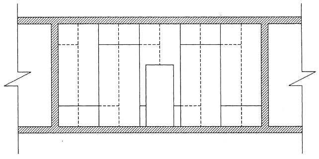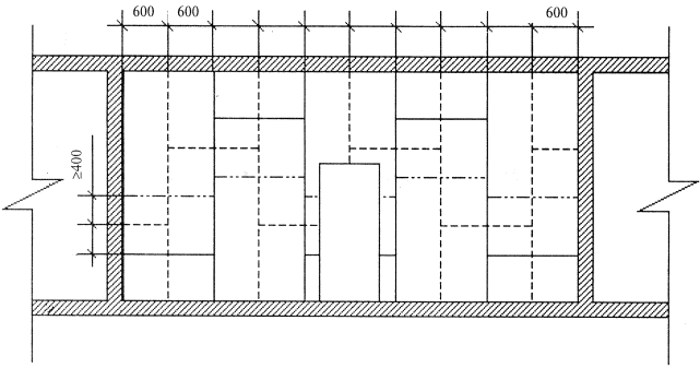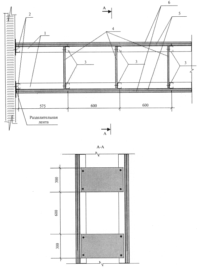 1 - направляющие профили пола; 2 - стоечные профили, примыкающие к основным конструкциям; 3 - стоечные профили; 4 - вставка из ГВЛВ; 5 - первый слой ГВЛВ; 6 - второй слой ГВЛВ Рисунок 20 - Конструкция перегородки С 366 с двойным металлическим каркасом с пространством для пропуска коммуникаций Рисунок 21 - Схема организации рабочего места при облицовке стен 1, 2, 3, 4 - нанесение точек на основные конструкции помещения; 5, 6, 7, 8 - разметка оси шнуроотбойным устройством Рисунок 22 Разметка проектного положения облицовки (разрез) Рисунок 23 - Схема крепления стоек каркаса с помощью прямых подвесов в облицовке С 663 Примечание - При устройстве деформационных швов требуется установить дополнительно два потолочных профиля по обеим сторонам шва. Рисунок 24 - Схема устройства деформационных швов в облицовке С 663. Рисунок 25 - Схема монтажа каркаса в облицовке С 665 Рисунок 26 - Схема монтажа каркаса в облицовке С 666
