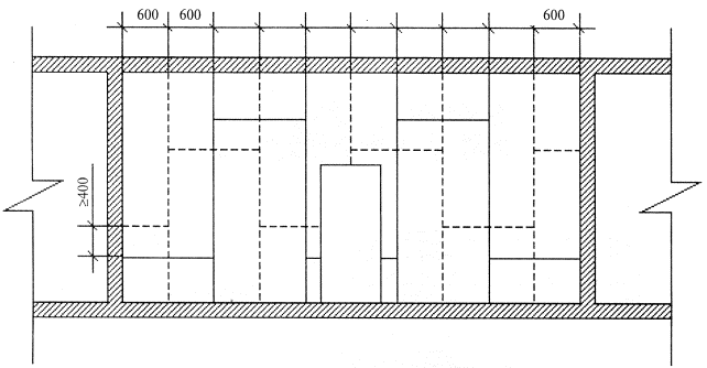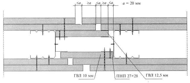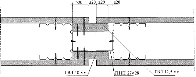 Соединение (удлинение) профилей производят с помощью просекателя методом «просечки с отгибом», в отдельных случаях - посредством винтов LN 3,5´9. Стоечные профили должны иметь высоту на 10 мм меньше расстояния между стенками верхних и нижних направляющих профилей. Установку направляющих профилей осуществляют согласно разметке их проектного положения на полу и на потолке. С целью повышения звукоизоляционной способности перегородки на стенки направляющих профилей ПН наклеивают уплотнительную ленту. После раскроя и полной подготовки направляющих профилей приступают к их монтажу по линии разметки на полу, а затем - на потолке. Крепление направляющих профилей осуществляют дюбелями с шагом не более 1 м. Закреплять профиль ПН необходимо не менее чем в трех точках независимо от его длины. При необходимости дополнительные отверстия в стенке направляющего профиля высверливают дрелью. Установку стоечных профилей также осуществляют согласно их проектному положению, а их типоразмер должен соответствовать рабочим чертежам (в рассматриваемом случае шаг стоек равен 600 мм). Предварительно на стоечные профили, примыкающие к конструкциям здания, наклеивают уплотнительную ленту. Стоечные профили устанавливают в закрепленные в проектном положении направляющие профили. Установку стоек начинают от стен, к которым профили крепятся дюбелями с шагом не более 1 м, но не менее трех креплений на одну стойку. Каждая стойка устанавливается строго вертикально и с помощью просекателя закрепляется к направляющему профилю на полу и на потолке. Закрепление производят не менее чем в двух точках с каждой стороны направляющего профиля (т.е. четыре просечки вверху и четыре просечки - внизу). Устройство вставок в каркасах 2-слойной перегородки не требуется. Каждую пару стоечных профилей соединяют полосами ГВЛ высотой 300 мм через 600 мм по высоте. Крепление полос производят самонарезающими винтами длиной 30 мм к каждому профилю (см. рисунок 20). В местах сопряжения перегородок с коммуникациями между стоечными профилями устанавливают перемычки из направляющего профиля с их закреплением просекателем к профилю ПС. При групповой прокладке трубопровода допускается устройство общего обрамления. При необходимости пропуска инженерных коммуникаций больших размеров допускается срезка вертикальных стоек с установкой по краям отверстия дополнительных стоечных профилей каркаса на всю высоту перегородки. В местах пересечения перегородок трубопроводами парового, водяного отопления и водоснабжения устанавливают гильзы. Контроль за точностью установки каркаса осуществляют с помощью складного метра, метростата или нивелира. На смонтированный в проектное положение каркас перегородки необходимо оформить акт приемки за подписью главного инженера строительной организации и лица-надзора от проектной организации. 2.10.3. Обшивка каркаса 1-м слоем ГВЛ с одной стороны. Перед установкой ГВЛ в местах примыкания обшивки к поверхностям потолка и стен (колонн), выполненных из другого материала, наклеивают разделительную ленту. Установка ГВЛ начинается от основной стены помещения в вертикальном положении. Перед установкой на торцах каждого ГВЛ, образующих горизонтальный стык, делают фальц шириной 30 мм и глубиной 2 мм (см. рисунок 5). Горизонтальную стыковку ГВЛ выполняют вра