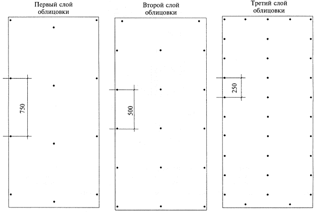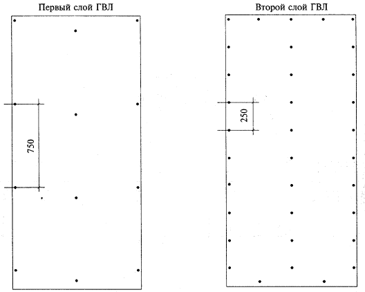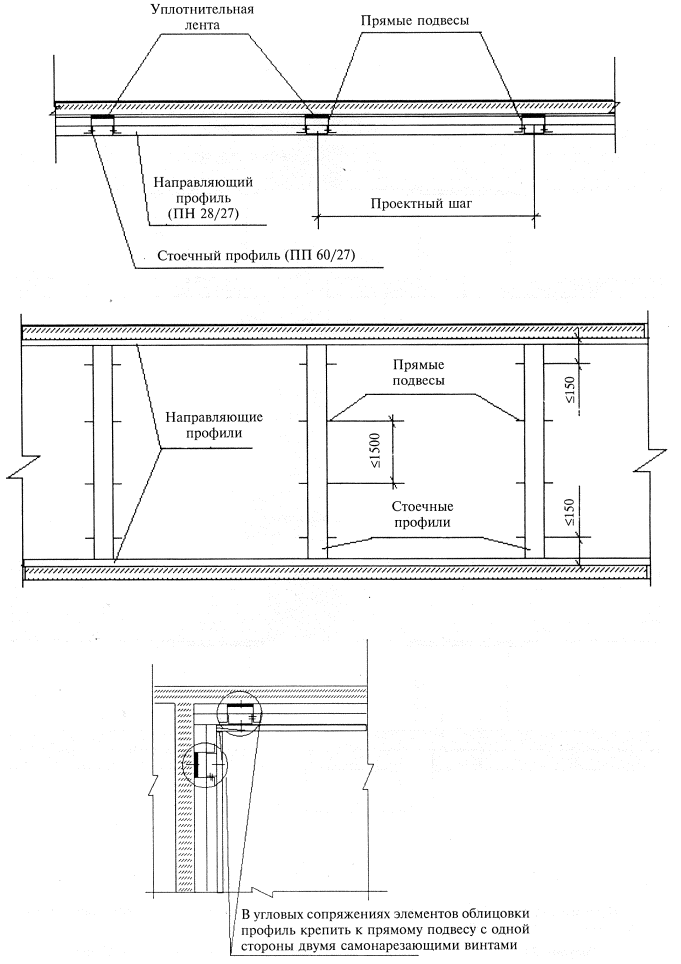 Рисунок 31 - Схема устройства каркаса подвесного потолка П 213 Рисунок 32 - Схема расположения листов ГВЛ и самонарезающих винтов в подвесных потолках СНиП 3.03.01-87. Несущие и ограждающие конструкции. СНиП 3.04.01-87. Изоляционные работы и отделочные покрытия. СНиП 12-03-2001 Безопасность труда в строительстве. Ч. 1. Общие требования. СНиП 12-04-2002. Безопасность труда в строительстве. Ч. 2. Строительное производство. СНиП 23-02-2003. Тепловая защита зданий. ГОСТ 9.303-84. Покрытия металлические и неметаллические неорганические. Общие правила к выбору. ГОСТ 12.1.013-78. Строительство. Электробезопасность. Общие требования. ГОСТ 12.1.044-89. ССБТ. Пожаровзрывоопасность веществ и материалов. Номенклатура показателей и методы их определения. ГОСТ 12.2.003-91. ССБТ. Оборудование производственное. Общие требования безопасности. ГОСТ 12.3.009-76. ССБТ. Работы погрузочно-разгрузочные. Общие требования безопасности. ГОСТ 12.3.033-84. ССБТ. Строительные машины. Общие требования безопасности при эксплуатации. ГОСТ 125-79. Вяжущие гипсовые. Технические условия. ГОСТ 8486-86. Пиломатериалы хвойных пород. Технические условия. ГОСТ 9573-96. Плиты из минеральной ваты на синтетическом связующем теплоизоляционные. Технические условия. ГОСТ 10499-95. Изделия теплоизоляционные из стеклянного штапельного волокна. Технические условия. ГОСТ 11652-80. Винты самонарезающие с потайной головкой и заостренным концом для металла и пластмассы. Конструкция и размеры. ГОСТ 14918-80. Сталь тонколистовая оцинкованная с непрерывных линий. Технические условия. ГОСТ 16381-77. Материалы и изделия строительные теплоизоляционные. Классификация и общие механические требования. ГОСТ 19904-90. Прокат листовой холоднокатаный. Сортамент. ГОСТ 21880-94. Маты прошивные из минеральной ваты теплоизоляционные. Технические условия. ГОСТ 24258-88. Средства подмащивания. Общие технические условия. ГОСТ 30244-94. Материалы строительные. Методы испытаний на горючесть. ГОСТ 30402-96. Материалы строительные. Методы испытаний на воспламеняемость. ГОСТ Р 51829-2001 Листы гипсоволокнистые. Технические условия. ТУ 1121-004-04001508-2003. Профили стальные, оцинкованные, тонкостенные. Технические условия. ТУ 5742-011-04001508-97. Шпаклевки гипсовые. Технические условия. ППБ 01-03 Правила пожарной безопасности в Российской Федерации. Серия 1.031.9-3.01. Комплектные системы КНАУФ. Перегородки поэлементной сборки из гипсоволокнистых листов на металлическом и деревянном каркасах для жилых общественных и промышленных зданий. Серия М25.41/2000. Комплектные системы КНАУФ. Облицовка из гипсоволокнистых листов ограждающих конструкций жилых, общественных и производственных зданий Стены. Мансардные помещения. Коммуникационные шахты. Серия 1.045.9-2.00. Комплектные системы КНАУФ. Подвесные потолки поэлементной сборки из гипсокартонных и гипсоволокнистых листов на деревянном и металлическом каркасах для жилых, общественных и производственных здании Инструменты и приспособления для монтажа ГВЛ