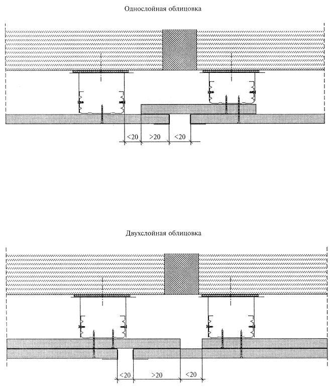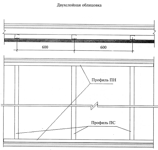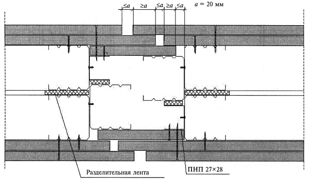 Соединение (удлинение) профилей производят с помощью просекателя методом «просечки с отгибом», в отдельных случаях посредством винтов LN 3,5´9. Стоечные профили должны иметь высоту на 10 мм меньше расстояния между стенками верхних и нижних направляющих профилей. Установку направляющих профилей осуществляют согласно разметке их проектного положения на полу и на потолке. С целью повышения звукоизоляционной способности облицовки на стенки направляющих профилей ПН наклеивают уплотнительную ленту. После раскроя и полной подготовки направляющих профилей приступают к их монтажу по линии раз метки на полу, а затем - на потолке. Крепление направляющих профилей осуществляют дюбелями с шагом не более 1 м. Закреплять профиль ПН необходимо не менее чем в трех точках независимо от его длины. При необходимости дополнительные отверстия в стенке направляющего профиля высверливают дрелью. Установку стоечных профилей также осуществляют по проектному положению, а их типоразмер должен соответствовать рабочим чертежам (в рассматриваемом случае шаг стоек равен 600 мм). Предварительно на стоечные профили, примыкающие к конструкциям здания, наклеивают уплотнительную ленту. Стоечные профили устанавливают в закрепленные в проектном положении направляющие профили. Установку стоек начинают от стен, к которым профили крепят дюбелями с шагом не более 1 м, но не менее трех креплений на одну стойку. Каждую стойку устанавливают строго вертикально и с помощью просекателя закрепляют к направляющему профилю на полу и на потолке. Закрепление производят не менее чем в двух точках с каждой стороны направляющего профиля (т.е. четыре просечки вверху и четыре просечки - внизу). В местах сопряжения облицовки с коммуникациями между стоечными профилями устанавливают перемычки из направляющего профиля с их закреплением просекателем к профилю ПС. При групповой прокладке трубопровода допускается устройство общего обрамления. При необходимости пропуска инженерных коммуникаций больших размеров допускается срезка вертикальных стоек с установкой по краям отверстия дополнительных стоечных профилей каркаса на всю высоту облицовки. В местах пересечения облицовки трубопроводами парового, водяного отопления и водоснабжения устанавливают гильзы. Контроль, за точностью установки каркаса, осуществляют с помощью складного метра, метростата или нивелира. Если длина облицовки превышает 15 м, то требуется устройство деформационного шва (см. рисунок 27). Кроме того, деформационные швы облицовки должны повторять деформационные швы здания. На смонтированный в проектное положение каркас облицовки необходимо оформить акт приемки за подписью главного инженера строительной организации и лица-надзора от проектной организации. 2.10.3. Прокладка проектных инженерных коммуникаций. Произведя монтаж каркаса облицовки, приступают к монтажу электротехнической проводки. Кабели размещают перпендикулярно стойкам каркаса в строгом соответствии с рабочим проектом. Не допускается размещать электропроводку вдоль стоек или внутри них во избежание ее повреждения при обшивке ГВЛ. Прокладку электросети выполняет специализированное звено электромонтажников. При необходимости производят прокладку и других коммуникационных сетей, предусмотренных проектом. 2.10.4. Установка и закрепле