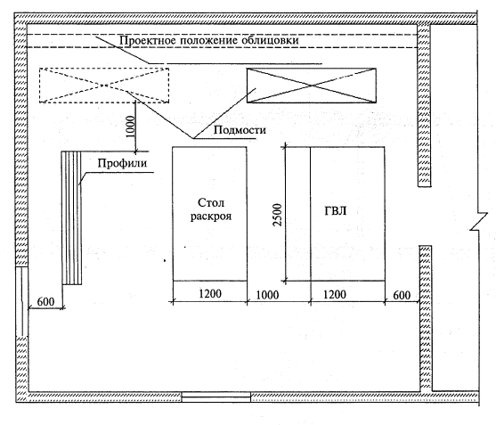 ГВЛ выпускаются с различными формами продольных кромок: фальцевая (ФК); прямая (ПК). Данная технологическая карта предусматривает обшивку каркаса ГВЛ с фальцевой кромкой (ФК). Масса 1 м2 (поверхностная плотность) ГВЛ - 1,05S < m < 1,2S (кг/м2), где S - толщина листа, мм. Удельная активность естественных радионуклидов не более 370 Бк/кг (ГОСТ 12.1.044-89*), т.е. ГВЛ относится к 1 группе. Пожаротехнические характеристики ГВЛ соответствуют: - горючесть - Г1 (ГОСТ 30244-94); - воспламеняемость - В1 (ГОСТ 30402-96); - дымообразующая способность - Д1 (ГОСТ 12.1.044-89); - токсичность - Т1 (ГОСТ 12.1.044-89). Отпускная влажность листов не должна превышать 1,5 %; плотность - не более 1250 кг/м3. 1.7. Для крепления каркаса к базовым стенам используют прямые подвесы, которые с помощью дюбелей крепят к стенам. Крепление ГВЛ к каркасу осуществляют самонарезающими винтами с зенкующей головкой. 1.8. Монтаж облицовки производят в период отделочных работ по окончании «мокрых» процессов, способных существенно повысить влажность воздуха внутри помещения, до устройства чистого пола. В помещениях, где производят монтаж облицовки С 663, температура воздуха не должна быть ниже +10 °С. Температурно-влажностный режим помещения должен соответствовать требованиям СНиП 23-02-2003 «Тепловая защита зданий». 1.9. Типовая технологическая карта разработана на измеритель конечной продукции 1 м2 облицовки. Привязка типовой технологической карты к конкретному объекту и условиям строительства состоит в уточнении необходимых материальных ресурсов и схем организации строительного процесса, соответствующего рабочим чертежам. 2. Организация и технология выполнения работ 2.1. К устройству облицовок С 663 рекомендуется приступать только после: - наличия утвержденной проектной документации (рабочих чертежей); - наличия проекта производства работ, который должен предусматривать комплексную механизацию работ с наиболее полным использованием специализированного инструмента и приспособлений, способствующих повышению производительности труда, сокращению сроков устройства облицовок, уменьшающих трудозатраты и создающих наиболее безопасные условия труда; - производства организационно-технологической подготовки, которая включает в себя подготовку необходимой оснастки, средств подмащивания и доставки ГВЛ в зону производства работ (см. рисунок 21). 2.2. До начала монтажа элементов облицовки необходимо закончить все общестроительные, а также строительно-монтажные работы, которые могут вызвать повышение влажности ГВЛ. Произвести уборку строительного мусора. Произвести инструментальную проверку соответствия основания для установки направляющих и стоечных профилей каркаса облицовки. Подготовленное основание должно быть оформлено актом приемки за подписью ответственных представителей строительной организации. 2.3. Работы по монтажу облицовки С 663 выполняют под руководством ИТР. Рабочие, выполняющие монтажные работы, должны пройти техническое обучение в учебных центрах «КНАУФ» или других специализированных учебных заведениях и иметь удостоверение на право производства работ. 2.4. Устройство облицовок производят поточно-расчлененным методом, по захваткам, со специализацией звеньев бригады на выполнение однотипных работ и оснащенных соответствующим набором инструментов, инвентаря и средств подмащивания. Каждое звено состо