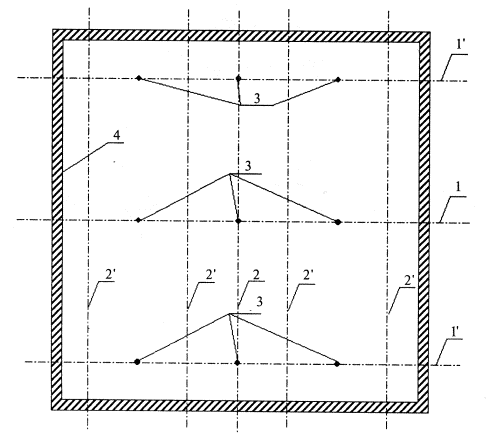 Рисунок 27 - Схема устройства деформационных швов в однослойной и двухслойной облицовках Рисунок 28 - Схема организации рабочего места при устройстве подвесных потолков 1, 2 - разметка центральных взаимно перпендикулярных осей; Г - разметка положения основных профилей; 2 - разметка положения несущих профилей; 3 - разметка положения подвесов потолка; 4 - разметка на примыкающих стенах помещения положения профилей ПНП (для конструкции П 213) Рисунок 29 - Разметка проектного положения подвесного потолка Межосевые расстояния при устройстве каркаса