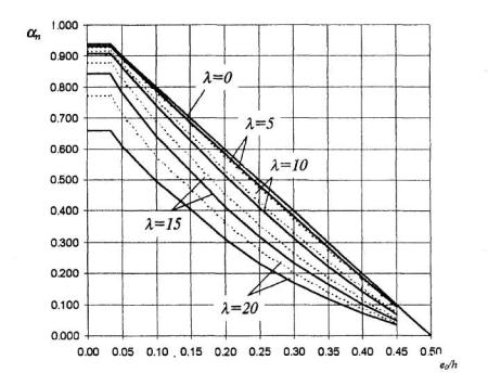 но не более 2; М1 - момент относительно растянутой или наименее сжатой грани сечения от действия постоянных, длительных и кратковременных нагрузок; М1l - то же, от постоянных и длительных нагрузок; dе- коэффициент, принимаемый равным eo/h, но не менее 0,15. Для стен и столбов с упруго неподвижными опорами указанное значение η, принимается при расчете сечений в средней трети высоты Н. При расчете опорных сечений, принимается η = 1,0, а в других сечениях - по линейной интерполяции. Если нижняя опора жестко защемлена, то при упругой верхней опоре определенное по формуле (3.6) значение η принимается для сечений нижнего участка высотой 2/3H. 3.11. Расчет с учетом прогиба внецентренно сжатых бетонных элементов прямоугольного сечения класса не выше В20 при lо £ 20h допускается производить из условия N £ αnRbh, (3.10) где αn - определяется по графику (черт. 3.2) в зависимости от значений eo/h и λ = lо h. 3.12. При действии значительных поперечных сил должно выполняться условие