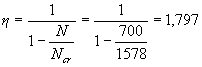 Допускается расчет бетонных элементов с учетом бетона растянутой зоны производить на основе нелинейной деформационной модели согласно пп.3.72 - 3.76, принимая в расчетных зависимостях площадь арматуры равной нулю. 3.10. Значение коэффициента η, учитывающего влияние прогиба на значение эксцентриситета продольной силы еo, определяется по формуле