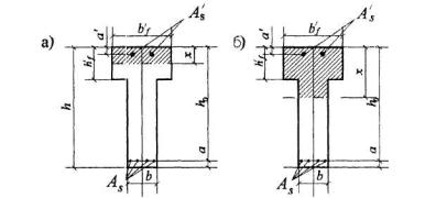 Черт.3.4. Положение границы сжатой зоны в тавровом сечении изгибаемого железобетонного элемента а-в палке; б - в ребре