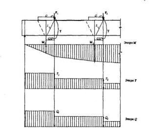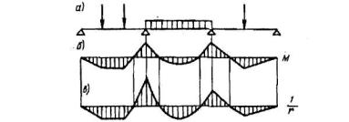 Черт.4.6. Эпюры изгибающих моментов и кривизны в железобетонном элементе постоянного сечения а - схема расположения нагрузки; б - эпюра моментов; в - эпюра кривизны В этом случае для свободно опертых и консольных элементов максимальный прогиб определяют по формуле