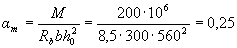 где При этом должно выполняться условие aт ≤ ar (см. табл. 3.2). 3.26. Значение b'f вводимое в расчет, принимают из условия, что ширина свеса полки в каждую сторону от ребра должна быть не более 1/6 пролета элемента и не более: а) при наличии поперечных ребер или при h'f ≥ 0,1h - 1/2 расстояния в свету между продольными ребрами; б) при отсутствии поперечных ребер (или при расстояниях между ними, больших, чем расстояния между продольными ребрами) и при h'f < 0,1h - 6h'f ; в) при консольных свесах полки при h'f ≥ 0,1h - 6h'f , при 0,05h ≤ h'f < 0,1h - 3h'f; при h'f < 0,05h - свесы не учитывают. Примеры расчетаПрямоугольные сеченияПример 2. Дано: сечение размером b = 300 мм, h = 600 мм; а = 40 мм; изгибающий момент с учетом кратковременных нагрузок М = 200 кНм; бетон класса В15 (Rb = 8,5 МПа); арматура класса А300 (Rs = 270 МПа). Требуется определить площадь сечения продольной арматуры. Расчет.. ho = 600 - 40 = 560 мм. Подбор продольной арматуры производим согласно п.3.21. По формуле (3.22) вычисляем значение am
