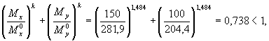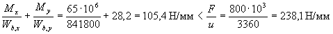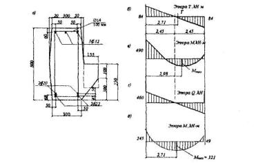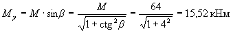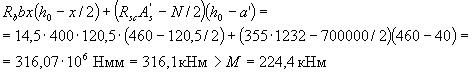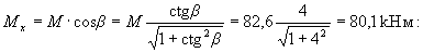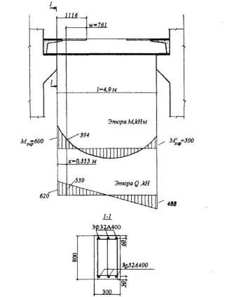 Rb[Aweb(h0-х1/3) + Sov,x] = 14,5[11588(359,8-173,1/3)+212,5·104] = 81,57·106 Н·мм > Mx = 80,1·106 Н·мм т.е. прочность сечения обеспечена. Пример 11. По данным примера 10 необходимо подобрать площадь растянутой арматуры при моменте в вертикальной плоскости M = 64кНм. Расчет. Составляющие изгибающего момента в плоскости осей у и х равны: