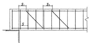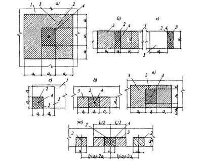 где lо,ап - базовая длина анкеровки, определяемая по формуле (5.1); As,cal, As,ef - см.п.5.33; a - коэффициент, учитывающий влияние напряженного состояния арматуры, конструктивного решения элемента в зоне соединения стержней, количества стыкуемой арматуры в одном сечении по отношению к общему количеству арматуры в этом сечении, расстояния между стыкуемыми стержнями. При соединении арматуры периодического профиля с прямыми концами, а также падких стержней с крюками или петлями без дополнительных анкерующих устройств коэффициент а для растянутой арматуры принимают равным 1,2, а для сжатой арматуры - 0,9. При этом должны быть соблюдены следующие условия: - относительное количество стыкуемой в одном расчетном сечении элемента рабочей растянутой арматуры периодического профиля должно быть не более 50%, гладкой арматуры (с крюками или петлями) - не более 25%; - усилие, воспринимаемое всей поперечной арматурой, поставленной в пределах стыка, должно быть не менее половины усилия, воспринимаемого стыкуемой в одном расчетном сечении элемента растянутой рабочей арматурой; - расстояние между стыкуемыми рабочими стержнями арматуры не должно превышать 4ds (черт.5.6,а); - расстояние между соседними стыками внахлестку (по ширине железобетонного элемента) должно быть не менее 2ds и не менее 30 мм (черт.5.6,б).