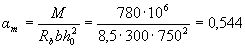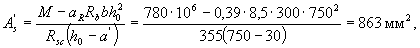 По табл. 3.2 находим ξR = 0,531. Так как проверяем условие (3.20): RsAs (ho-0, 5x) = 355·2945· (730 - 0,5·240) = 636,8·106 Н мм = 636,8 кНм >M = 550кНм, т.е. прочность сечения обеспечена. Пример 4. Дано: сечение размерами b= 300 мм, h = 800 мм; а = 50 мм; арматура класса А400 (Rs = Rsc = 355 МПа); изгибающий момент М = 780 кНм; бетон класса В15 (Rb = 8,5 МПа). Требуется определить площадь сечения продольной арматуры. Расчет.. ho = h - а = 800-50=750 мм. Требуемую площадь продольной арматуры определяем согласно п.3.21. По формуле (3.22) находим значение am:
