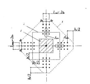 Черт.5.3. Конструкция пространственных арматурных каркасов в сжатых элементах 5.25. В железобетонных стенах поперечные стержни, нормальные плоскости стены, располагаются на расстояниях по вертикали не более 20d, а по горизонтали не более 600 мм. При этом, если требуемая по расчету продольная арматура имеет насыщение меньше минимального процента армирования (см. табл.5.2), поперечные стержни можно располагать на расстояниях по вертикали не более 600 мм, а по горизонтали не более 1000 мм. При насыщении продольной арматуры железобетонных стен более 2% поперечные стержни должны располагаться на расстояниях по вертикали не более 15d и не более 500 мм, а по горизонтали не более 400 мм и не более 2-х шагов вертикальных стержней. В этом пункте d - диаметр вертикальных стержней. 5.26. Поперечную арматуру в плитах в зоне продавливания в направлении, перпендикулярном сторонам расчетного контура, устанавливают с шагом не более ho/3 и не далее 300 мм. Стержни, ближайшие к контуру грузовой площади, располагают не ближе ho/3 и не далее ho/2 от этого контура. При этом ширина зоны постановки поперечной арматуры (от контура грузовой площади) должна быть не менее 1,5ho. Расстояния между стержнями поперечной арматуры в направлении, параллельном сторонам расчетного контура, принимают не более 1/4 длины соответствующей стороны расчетного контура. 5.27. Поперечная арматура в виде сварных сеток косвенного армирования при местном сжатии (смятии) должна удовлетворять следующим требованиям: а) площади стержней сетки на единицу длины в одном и другом направлении не должны различаться более чем в 1,5 раза; б) шаг сеток (расстояние между сетками в осях стержней одного направления) следует принимать не менее 60 и не более 150 мм; в) размеры ячеек сеток в свету должны быть не менее 45 и не более 100 мм; г) первая сетей располагается на расстоянии 15-20 мм от нагруженной поверхности элемента. 5.28. Поперечная арматура, предусмотренная для восприятия поперечных сил и крутящих моментов, должна иметь замкнутый контур с надежной анкеровкой по концам путем приварки или охвата продольной арматуры, обеспечивающую равнопрочность соединений и поперечной арматуры. АНКЕРОВКА АРМАТУРЫ5.29. Анкеровку арматуры осуществляют одним из следующих способов или их сочетанием: - в виде прямого окончания стержня (прямая анкеровка); - с загибом на конце стержня в виде крюка, отгиба (лапки) или петли; - с приваркой или установкой поперечных стержней; - с применением специальных анкерных устройств на конце стержня. 5.30. Прямую анкеровку и анкеровку с лапками допускается применять только для арматуры периодического профиля. Для растянутых гладких стержней следует предусматривать крюки, петли, приваренные поперечные стержни или специальные анкерные устройства. Лапки, крюки и петли не рекомендуется применять для анкеровки сжатой арматуры, за исключением гладкой арматуры, которая может подвергаться растяжению при некоторых возможных сочетаниях нагрузки. 5.31. При расчете длины анкеровки арматуры следует учитывать способ анкеровки, класс арматуры и ее профиль, диаметр арматуры, прочность бетона и его напряженное состояние в зоне анкеровки, конструктивное решение элемента в зоне анкеровки (наличие поперечной арматуры, положение стержней в сечении элемента и др.). 5.32. Базовую (основную) длину анкеровки, необходимую для передачи у