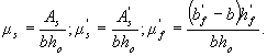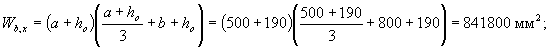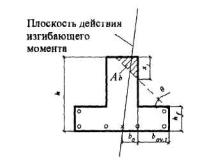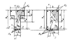 где S0v,y, S0v,x - статические моменты площади Aov относительно соответственно оси х и у; β - угол наклона плоскости действия изгибающего момента к оси х, т.е. ctg β = Mx/My (My - составляющая изгибающего момента в плоскости оси у); bо - расстояние от центра тяжести сечения растянутой арматуры до наиболее сжатой боковой грани ребра (стороны). При расчете прямоугольных сечений значения Aov, S0v,y, S0v,x принимаются равными нулю. Если Аb < Aov или х1 < 0,2h'f, расчет производится как для прямоугольного сечения шириной b = b'f. Если выполняется условие