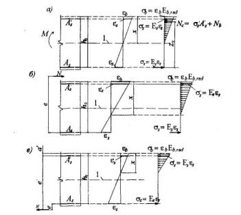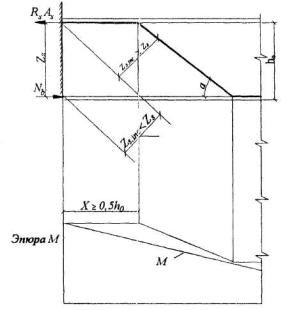 Черт.3.3. Схема усилий и эпюра напряжений в поперечном прямоугольном сечении изгибаемого железобетонного элемента Если вычисленная без учета сжатой арматуры (As= 0,0) высота сжатой зоны х меньше 2а', проверяется условие (3.19), где вместо а' подставляется х/2. 3.19. Изгибаемые элементы