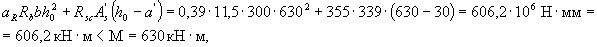 Принимаем 3Æ36 (Аs = 3054 мм2). Пример 6. Дано: сечение размерами b = 300 мм, h = 700 мм; а = 70 мм; а' = 30 мм; бетон класса В20 (Rb =11,5 МПа); арматура класса А400 (Rs = Rsc = 355 МПа); площадь сечения растянутой арматуры As = 4826 мм2 (6Æ32), сжатой - А's= 339 мм2 (3Æ12); изгибающий момент М = 630 кН м Требуется проверить прочность сечения. Расчет. ho = 700 - 70 = 630 мм. Проверку прочности сечения производим согласно п.3.18. По формуле (3.16) определяем высоту сжатой зоны х: