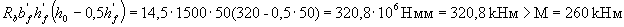 т.е. прочность согласно этому условию не обеспечена. Уточним правую часть условия (3.18) путем замены значения ar на (0,7 ar + 0,3 am), где am = ξ(1 - 0,5 ξ ) = 0,733(1- 0,5·0,733) = 0,464: (0,7·0,39 + 0,3·0,464)11,5·300·6302 + 355·339·600 = 636,6·106 Н·мм = 636,6 кН·м > М = 630 кНм, т.е. прочность обеспечена. Тавровые и двутавровые сеченияПример 7. Дано: сечение размерами b'f = 1500 мм, h'f= 50 мм, b = 200 мм, h = 400 мм; а = 80 мм; бетон класса В25 (Rb = 14,5 МПа), арматура класса А400 (Rs = 355 МПа); изгибающий момент М = 260 кНм. Требуется определить площадь сечения продольной арматуры. Расчет. hо = 400 - 80 = 320 мм. Расчет производим согласно п.3.25 в предположении, что сжатая арматура по расчету не требуется. Проверим условие (3.32), принимая As = 0: