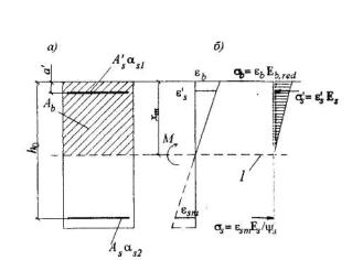 Черт.4.7. Приведенное поперечное сечение (а) и схема напряженно-деформированного состояния изгибаемого элемента с трещинами при расчете его по деформациям (б) 1 -уровень центра тяжести приведенного сечения Значения коэффициентов приведения арматуры к бетону принимают равными: для сжатой арматуры - для растянутой арматуры – где ψ - см.п.4.13. Коэффициент as1 можно также определять по формулам: при непродолжительном действии нагрузки - при продолжительном действии нагрузки и