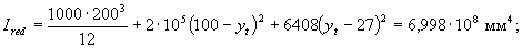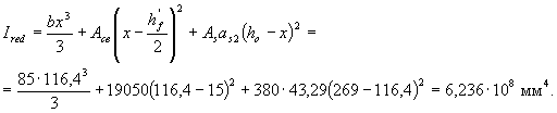 где Ired - момент инерции приведенного сечения относительно его центра тяжести, определяемый по общим правилам сопротивления упругих материалов с учетом площади сечения бетона только сжатой зоны, площадей сечения сжатой арматуры с коэффициентом приведения as1 и растянутой арматуры с коэффициентом приведения as2 (черт.4.7); Eb.red - приведенный модуль