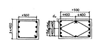 Черт.5.2. Конструкция отгибов арматуры Прямые участки отогнутых гладких стержней должны заканчиваться крюками. Расстояние от грани свободной опоры до верхнего конца первого отгиба (считая от опоры) должно быть не более 50 мм. Угол наклона отгибов к продольной оси элемента следует принимать в пределах 30 - 60°, рекомендуется принимать угол 45°. 5.23. Во внецентренно сжатых линейных элементах, а также в изгибаемых элементах при наличии необходимой по расчету сжатой продольной арматуры, с целью предотвращения выпучивания продольной арматуры следует устанавливать поперечную арматуру с шагом не более 15d и не более 500 мм (d - диаметр сжатой продольной арматуры). Если насыщение сжатой продольной арматуры, устанавливаемой у одной из граней элемента, более 1,5%, поперечную арматуру следует устанавливать с шагом не более 10d и не более 300 мм. Расстояния между хомутами внецентренно сжатых элементов в местах стыкования рабочей арматуры внахлестку без сварки должны составлять не более 10d. 5.24. Конструкция хомутов (поперечных стержней) во внецентренно сжатых линейных элементах должна быть такой, чтобы продольные стержни (по крайней мере через один) располагались в местах перегибов, а эти перегибы - на расстоянии не более 400 мм по ширине грани. При ширине грани не более 400 мм и числе продольных стержней у этой грани не более четырех допускается охват всех продольных стержней одним хомутом (черт.5.3).