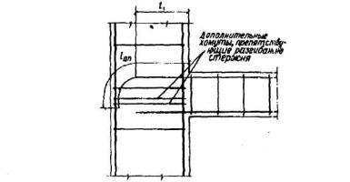 Черт.5.6 Расположение стержней, стыкуемых внахлестку, и самих стыков а - расположение стержней в стыке; б - расположение стыков В качестве одного расчетного сечения элемента, рассматриваемого для определения относительного количества стыкуемой арматуры в одном сечении, принимают участок элемента вдоль стыкуемой арматуры длиной 1,3ll. Считается, что стыки арматуры расположены в одном расчетном сечении, если центры этих стыков находятся в пределах длины этого участка (черт.5.6,б). Допускается увеличивать относительное количество стыкуемой в одном расчетном сечении элемента рабочей растянутой арматуры до 100%, принимая значение коэффициента а равным 2,0. При относительном количестве стыкуемой в одном расчетном сечении арматуры периодического профиля более 50% и гладкой арматуры более 25% значения коэффициента а определяют по линейной интерполяции. При наличии дополнительных анкерующих устройств на концах стыкуемых стержней (приварка поперечной арматуры, загиба концов стыкуемых стержней периодического профиля и др.) длина перепуска стыкуемых стержней может быть уменьшена, но не более чем на 30%. В любом случае фактическая длина перепуска должна быть не менее 0,4a·l0,an , не менее 20ds и не менее 250 мм. 5.39. При соединении арматуры с использованием сварки выбор типов сварного соединения и способов сварки производят с учетом условий эксплуатации конструкции, свариваемости стали и требований по технологии изготовления в соответствии с действующими нормативными документами (ГОСТ 14098-91). 5.40. При использовании для стыков арматуры механических устройств в виде муфт (муфты на резьбе, спрессованные муфты и т.д.) несущая способность муфтового соединения должна быть такой же, что и стыкуемых стержней (соответственно при растяжении или сжатии). Концы стыкуемых стержней следует заводить на требуемую длину в муфту, определяемую расчетом или опытным путем. При использовании муфт на резьбе должна быть обеспечена требуемая затяжка муфт для ликвидации люфта в резьбе. ГНУТЫЕ СТЕРЖНИ5.41. При применении гнутой арматуры (отгибы, загибы концов стержней) минимальный диаметр загиба отдельного стержня должен быть таким, чтобы избежать разрушения или раскалывания бетона внутри загиба арматурного стержня и его разрушения в месте загиба (см .пп.5.22,5.36). Минимальный диаметр оправки dоп для арматуры принимают в зависимости от диаметра стержня ds не менее: - для гладких стержней dоп = 2,5ds при ds < 20 мм; dоп = 4ds при ds ≥ 20 мм; - для стержней периодического профиля dоп = 5ds при ds < 20 мм; dоп = 8ds при ds ≥ 20 мм. ТРЕБОВАНИЯ К БЕТОННЫМ И ЖЕЛЕЗОБЕТОННЫМ КОНСТРУКЦИЯМ5.42. Размеры сборных бетонных и железобетонных элементов следует назначать с учетом грузоподъемности и габаритных ограничений технологического, транспортного и монтажного оборудования на заводах-изготовителях и на строительных площадках. В необходимых случаях следует учитывать возможность подъема железобетонного изделия вместе с формой. 5.43. Во избежание повреждений от местных концентраций напряжений при резком изменения направлений граней элемента (например, во внутренних углах) рекомендуется предусматривать смягчение очертания в виде уклонов, фасок или закруглений по возможности небольшой величины (до 50 мм), чтобы не требовалось местное армирование (черт.5.7,а, б, в). Во внешних острых углах во избежание откалывания бето