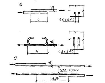 Черт.5.5. Анкеровка арматуры путем отгиба СОЕДИНЕНИЯ АРМАТУРЫ5.37. Для соединения арматуры принимают один из следующих типов стыков: а) стыки внахлестку без сварки: - с прямыми концами стержней периодического профиля; - с прямыми концами стержней с приваркой или установкой на длине нахлестки поперечных стержней; - с загибами на концах (крюки, лапки, петли); при этом для гладких стержней применяют только крюки и петли. б) сварные и механические стыковые соединения: - сваркой арматуры; - с применением специальных механических устройств (стыки с опрессованными муфтами, резьбовыми муфтами и др.). 5.38. На соединения арматуры внахлестку распространяются указания п.5.30. Стыки растянутой или сжатой арматуры должны иметь длину перепуска (нахлестки) не менее значения длины ll, определяемого по формуле