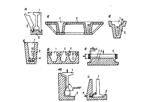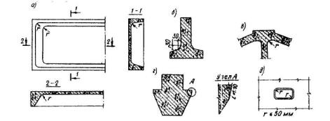Черт. 5.7. Закругления в фаски а - закругления в ребристой плите; б - фаска между полкой и стенкой в тавровой балке; в - сочетание фаски и закругления в уме фермы; г- смягчение острого угла в ригеле; д - закругление в отверстии для пропуска коммуникаций, строповки и т.п. 5.44. Отверстия в железобетонных элементах для пропуска коммуникаций, строповки и т. п. следует принимать по возможности небольшими и располагать в пределах ячеек арматурных сеток и каркасов так, чтобы не нужно было перерезать арматуру и армировать по месту. Углы отверстий желательно делать плавными (черт.5.7,д) 5.45. При проектировании бетонных и железобетонных конструкций их очертание следует принимать с учетом устройства и способа использования форм (опалубки). При применении форм с откидными бортами очертание изделия не должно препятствовать повороту борта (черт.5.8,а) при распалубке. При применении неразъемных форм для возможности извлечения изделия из них должны предусматриваться технологические уклоны не менее 1:10 (черт.5.8,б, в). В случае применения неразъемных форм с использованием выпрессовывания уклон должен быть не менее 1:15 (черт.5.8,г). При немедленной распалубке с обеспечением фиксированного (во избежание нарушения бетона) вертикального перемещения формующего элемента оснастки (черт.5.8,д, е) уклон должен быть не менее 1:50.