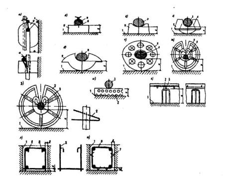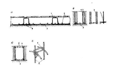 Черт.5.14. Фиксаторы однократного использования, обеспечивающие одновременно требуемую толщину защитного слоя бетона и расстоянияm между отдельными арматурными элементами а - в плоских плитах; б и в - в балках прямоугольного сечения; г - в элементах кольцевого сечения 1 - фиксатор типа П-образного каркаса; 2 - арматурные сетки; 3 –рабочая поверхность формы; 4 - фиксатор типа каркаса-гребенки; 5 - плоский арматурный каркас; 6 - фиксаторы-стержни, дополнительно привариваемые к каркасами; 7 - фиксатор типа накладной скобы из арматурной проволоки; 8 - концентрически расположенные каркасы; 9-место связки Для фиксаторов однократного использования, выполняемых из арматурной стали, следует выполнять чертежи. На рабочих чертежах арматурных изделий и в случае необходимости на чертежах общих видов армирования железобетонных элементов следует показывать расположение этих фиксаторов или опорных стержней, а в спецификациях предусматривать расход стали на их изготовление. Расположение и число неметаллических фиксаторов-подкладок в рабочих чертежах допускается не приводить.