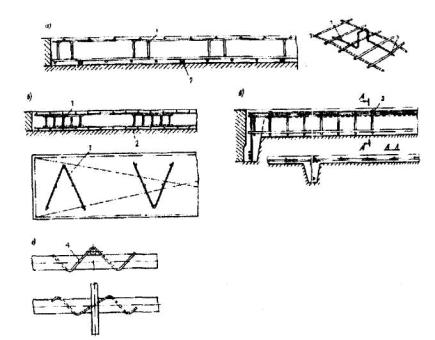 Черт.5.13. Фиксаторы однократного использования, обеспечивающие требуемое расстояние a-в - между отдельными арматурными изделиями; г- между стержнями 1 - разделитель из арматурной стали, устанавливаемый между рядами сеток; 2 - фиксатор-подкладка для обеспечения защитного слоя бетона; 3 - удлиненные поперечные стержни каркаса, загибаемые вокруг стержней сетки, 4 - фиксатор для соединения перекрещивающихся стержней (пространственная спираль из пружинной проволоки); 5 - место связки В растянутой зоне бетона элементов, эксплуатируемых в условиях агрессивной среды, не допускается устанавливать пластмассовые подкладки под стержни рабочей арматуры или вплотную к ним - под стержни распределительной арматуры. В таких изделиях следует применять преимущественно подкладки из плотного цементно-песчаного раствора, бетона или асбестоцемента. 5.54. В случае применения фиксаторов однократного использования следует в соответствии с требованиями табл.5.6 указывать на рабочих чертежах, какие из этих фиксаторов допускаются в данном элементе. Толщину защитного слоя бетона в месте установки фиксатора-подкладки рекомендуется принимать кратной 5 мм.
