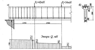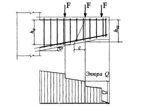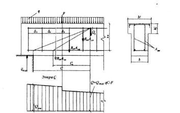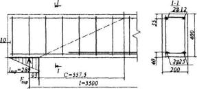 параметру На графике координатам aтх = 0,185 и amy = 0,072 соответствует значение as = 0,20. Тогда согласно формуле (3.42) площадь сечения растянутой арматуры будет равна Аs = (as boho + Aov)Rb/Rs = (0,2·90·360 + 6750)14,5/355 = 540,4 мм2. Принимаем стержни 3Æ16 (Аs = 603 мм2) и располагаем их, как показано на черт.3.8. РАСЧЕТ ЖЕЛЕЗОБЕТОННЫХ ЭЛЕМЕНТОВ ПРИ ДЕЙСТВИИ ПОПЕРЕЧНЫХ СИЛ3.29. Расчет элементов при действии поперечных сил должен обеспечить прочность: - по полосе между наклонными сечениями согласно п.3.30; - на действие поперечной силы по наклонному сечению согласно пп.3.31- 3.42; - на действие момента по наклонному сечению согласно пп.3.43-3.48. Расчет железобетонных элементов по полосе между наклонными сечениями3.30. Расчет изгибаемых элементов по бетонной полосе между наклонными сечениями производят из условия Q < 0,3Rbbho, (3.43) где Q - поперечная сила в нормальном сечении, принимаемая на расстоянии от опоры не менее ho. Расчет железобетонных элементов по наклонным сечениям на действие поперечных силЭлементы постоянной высоты, армированные хомутами, нормальными к оси элемента3.31. Расчет изгибаемых элементов по наклонному сечению (черт.3.9) производят из условия Q < Qb + Qsw, (3.44) где Q - поперечная сила в наклонном сечении с длиной проекции с от внешних сил, расположенных по одну сторону от рассматриваемого наклонного сечения; при вертикальной нагрузке, приложенной к верхней грани элемента, значение Q принимается в нормальном сечении, проходящем на расстоянии с от опоры; при этом следует учитывать возможность отсутствия временной нагрузки на приопорном участке длиной с; Qb - поперечная сила, воспринимаемая бетоном в наклонном сечении; Qsw - поперечная сила, воспринимаемая хомутами в наклонном сечении. Поперечную силу Qb определяют по формуле