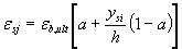 - где εs,max и εs,min - абсолютные значения деформаций максимально и минимально растянутых стержней арматуры, определяемые согласно п.п.3.72-3.75; hs - расстояние между этими стержнями в направлении, нормальном условной нейтральной оси. При этом для элемента с трещинами в растянутой зоне напряжения в арматуре, пересекающей трещину, определяется по формуле σsi = Es (εsi +0,8εs,crc), (4.50) где εsi - усредненная относительная деформация растянутой арматуры в рассматриваемой стадии расчета, соответствующая линейному закону распределения деформаций по сечению; εs,crc - относительная деформация растянутой арматуры в сечении с трещиной сразу после образования трещин (т.е. при действии момента Мсrс), равная εs,crc = σs,crc / Es, где σs,crc - см. п.4.13. При наличии трещин напряженно-деформированное состояние сжатого бетона определяется по двухлинейной диаграмме σb – εb с использованием приведенного модуля деформаций сжатого бетона Eb.red, определяемого согласно п.4.24, и значений εb0 и εb2, принимаемых по табл.4.7. При отсутствии трещин