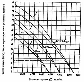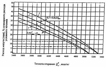 Первый заместитель начальника А.В. БОБЫЛЕВ Срок первой проверки СО - Взамен РД 34.25.503 (HP 34-00-112-86) Настоящий стандарт организации распространяется на энергоблоки России, а также стран СНГ и Балтии, и устанавливает минимальные допустимые нагрузки для энергоблоков с котлами на твердом топливе и с газомазутными котлами. Для большинства энергоблоков на сверхкритические параметры пара разгрузка может осуществляться на скользящем давлении во всем пароводяном тракте. Содержание 1 ОБЩИЕ ПОЛОЖЕНИЯ1.1 Минимальная допустимая нагрузка энергоблока определяется в основном, надежной работой котла. 1.2 Для энергоблоков с котлами, работающими на каменных углях с выходом летучих веществ менее 20 % (марок АШ, Т), расход мазута или газа на подсветку факела для обеспечения устойчивого горения в топочной камере и надежного выхода жидкого шлака при минимальной допустимой нагрузке определяется по номограммам, приведенным на рисунках 1 и 2. 1.3 Для энергоблоков с котлами, сжигающими угли с теплотой сгорания 3900-4500 ккал/кг (16,32-18,34 МДж/кг) при твердом шлакоудалении, а также топливо непроектных марок, расход мазута и газа на подсветку приведен в разделе 2. 1.4 В установленном Нормами диапазоне нагрузок энергоблоков допускается снижение температуры промперегрева до 510 °С (не ниже) при нагрузке 40-50 % номинальной; при частичных нагрузках допускается повышение коэффициента избытка воздуха. Рисунок 1 - Расход мазута (1) или газа (2) на подсветку факела для обеспечения устойчивого горения в топочной камере для углей марки АШ Рисунок 2 - Расход мазута (1) или газа (2) на подсветку факела для обеспечения устойчивого горения в топочной камере для углей марки Т 1.5 Все энергоблоки сверхкритического давления за исключением энергоблоков 300 МВт с котлами типа ТПП-110, ТПП-210 и П-74 могут разгружаться на скользящем давлении. Энергоблоки 500 МВт с котлами типов П-57 могут разгружаться на скользящем давлении после выполнения на котле реконструкции. 1.6 Разгрузку блоков 800 МВт с котлами П-67 производить на скользящем давлении по следующему регламенту: - с нагрузки 750 МВт до 550 МВт со снижением давления перед стопорными клапанами турбины с 240 кгс/см2 (~24 МПа) до 170 кг/см2 (~17МПа); - с нагрузки 550 МВт до нижнего предела разгрузки 450 МВт производить при постоянном давлении перед стопорными клапанами 170 кгс/см2 (~17 МПа). 1.7 Однокорпусный режим работы дубль-блоков может использоваться, как исключение, при особых затруднениях в прохождении минимума электрической нагрузки в энергосистеме. В однокорпусном режиме минимальная нагрузка устанавливается на следующем уровне: - для дубль-блоков, при разгрузке на номинальном давлении, 50 % указанной в Нормах нагрузки, но не менее 30 % номинальной; - для дубль-блоков 300 МВт при их работе на скользящем давлении: с котлами П-50, ТПП-210А - 120 МВт; с котлами ПК-39, ПК-39-1 и ПК-39-2 - 140 МВт. На дубль-блоках с котлами ПК-41, ПК-41-1, ТГМП-114 и П-50 (при работе на газе), для которых при работе на скользящем давлении минимальная нагрузка в однокорпусном режиме установлена на том же уровне, что и в двухкорпусном (40 % номинальной), применять однокорпусный режим работы для регулирования графика нагрузки энергосистем не разрешается. 1.8 Указанные в разделе 2 минимальные допустимые нагрузки для энергоблоков сверхкритического давления при разгрузке на скользящем давлении установлены для условий работы с вкл
