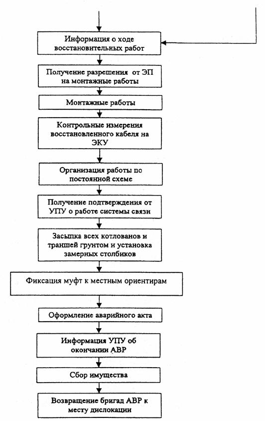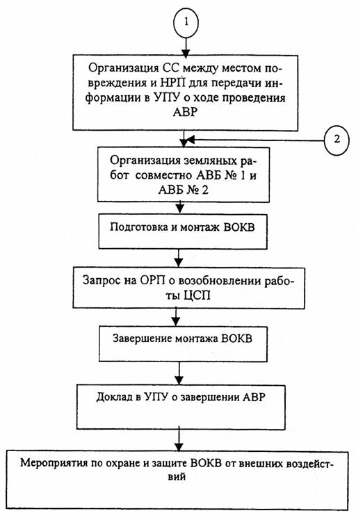 Рисунок 4.1, лист 4 4.2.2 Определение участка неисправности, оповещение, сбор и выезд бригад 4.2.2.1 Поврежденный ЭКУ определяется дежурным техперсоналом ОРП по сигналам телемеханики или на основании данных системы управления линии передачи. 4.2.2.2 О результатах определения неисправного ЭКУ технический персонал ОРП по установленной схеме оповещения ставит в известность УПУ, оповещает АВБ № 1, сообщает начальнику и главному инженеру ЭП, записывает в журнал сведения о начале аварии, когда и кому сообщено об этом. 4.2.2.3 Получив сведения от дежурного персонала о поврежденном ЭКУ, АВБ № 1* немедленно выезжает на трассу поврежденной кабельной линии. 4.2.2.4 Начальник ЛТЦ, получив сообщение об аварии, не ожидая результатов измерений определения точного участка повреждения, немедленно приступает к сбору и подготовке АВБ № 2 к выезду на трассу. 4.2.2.5 Сбор АВБ № 2 производится по заранее разработанной схеме. 4.2.2.6 На участках линий передачи с медножильными кабелями, где не обеспечена передача встречного ДП, дежурным персоналом ОРП на линию высылается АВБ № 3 с КВПС. 4.2.2.7 Если поврежденный ЭКУ определен по системе телемеханики до выезда, то АВБ № 1 должна следовать до ближайшего НРП, ограничивающего поврежденный участок. По прибытии в НРП устанавливается связь (проводная или радиосвязь) с ОРП. Если до выезда бригады участок неисправности не был определен, то в пути должна постоянно поддерживаться радиосвязь бригады с ОРП. При отсутствии радиосредств связь с ОРП устанавливается с каждого четного НРП. * При выезде на аварию автомашина с бригадой ЛТЦ (ЦКЛС) должна быть укомплектована в соответствии с приложением А; а также фиксированной документацией трассы кабельной линии, электрическим паспортом (с обязательным приложением к нему рефлектограммы коаксиальной кабельной линии) на кабельную линию, технологической картой на проведение АВР. 12РД 45.211-2001 4.2.3 Уточнение участка и места неисправности 4.2.3.1 По прибытии на ближайший НРП предполагаемого неисправного ЭКУ, АВБ № 1, установив связь с ОРП, выполняет следующие операции: - снимает дистанционное питание со стороны поврежденного участка медножидьных кабелей; - уточняет правильность определения участка неисправности контрольными измерениями кабеля; - при расхождении данных телемеханики и контрольных измерений сообщает о результатах измерения на ОРП, включает ДП на линии с медножильным кабелем и выезжает на следующий НРП. 4.2.3.2 При совпадении результатов контрольных измерений с данными телемеханики уточняется характер неисправности. После подготовки шлейфа по ДП на линии с медножильным кабелем и передачи результатов измерений на ОРП один электромеханик выезжает с бригадой на следующий НРП, а второй электромеханик остается на первом НРП для поддержки связи и проведения измерений. По пути следования АВБ № 1 на следующий НРП в районе предполагаемой неисправности высаживается кабельщик-спайщик с необходимым оснащением и производит тщательный осмотр трассы. При обнаружении внешним осмотром места неисправности кабельщик-спайщик приступает к отрытию котлована. 4.2.3.3 По прибытии на следующий НРП и организации служебной связи с предыдущим НРП производится: - переключение систем на работу по одному кабелю (для системы К60П при неисправности одного кабеля); - измерение параметров неисправных цепей кабе