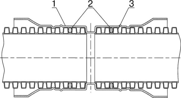 Рис. 2. Узел соединения гофрированных труб муфтой с резиновым уплотнением 1 - муфта соединительная; 2 - уплотнительное кольцо; 3 - труба гофрированная двухслойная; 3. Проектирование подземной самотечной канализации с применением полиэтиленовых гофрированных труб производства НПО «Стройполимер»3.1. Определение расчетного расхода сточных вод 3.1.1.Определение расчетного расхода сточных вод qs, л/с, следует выполнять по формуле: